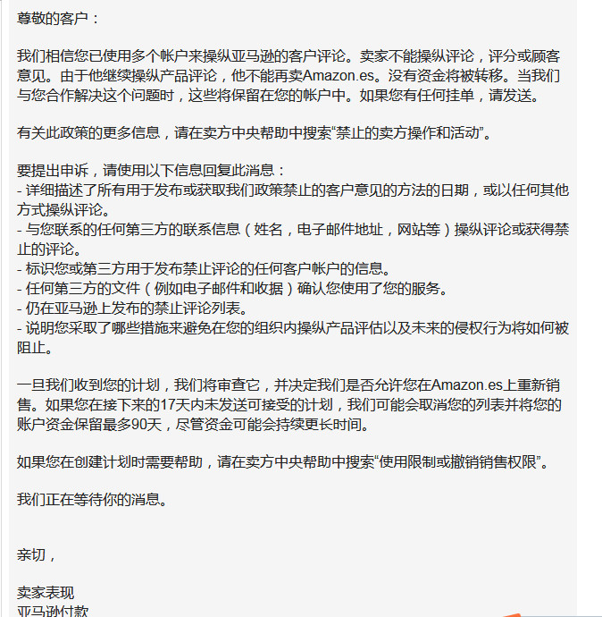 在邮件中亚马逊指控卖家用多个买家账号操控客户评论,卖家操控评论是被禁止的行为。