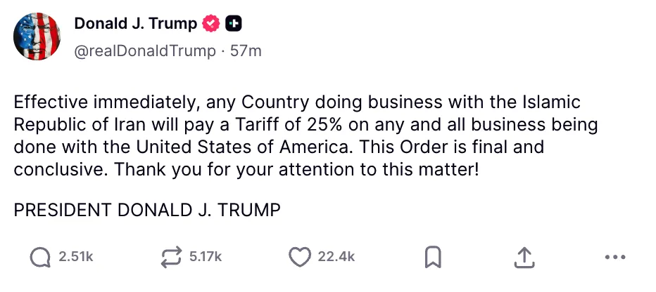 当地时间1月12日,特朗普在社交媒体上表示:“即日起,任何与伊朗有贸易往来的国家,其与美国所有商业交易都将被征收25%的关税。此项命令为最终决定。”