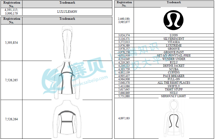 案件涉及多项Lululemon美国注册商标,覆盖第25类与第35类,包含T 恤、运动裤、瑜伽裤、夹克、帽子、围巾等服装服饰。赛贝提醒,未经授权,任何卖家都不得随意使用上述商标,哪怕是近似使用都可能构成侵权。