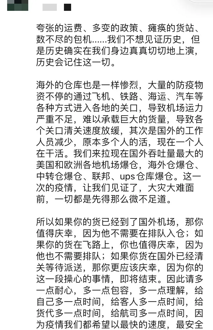 随着五一的结束,引发了航空业的各种并发症,原本就运力不足,却遇上五一小长假,加上海关查验和部分机场的货站准备不足,导致机场货站不堪重负濒临瘫痪。 过去几天里深圳、广州、上海等省份已经有多家航空和货代公司喊停,各种爆仓和拥堵的消息传遍朋友圈,航空业迎来史无前例的挑战,卖家们亏损无数,货代和客户也苦不堪言,进退两难。 (图片来源:货代朋友圈截图) “空运已经完全发不起了,包机也是一天一个价,现在E邮包瘫痪,就连USPS也暂停服务了。”有卖家说道。 从昨天开始,就有卖家收到关于USPS国际配送服务中断的消息,由于大范围的运输取消和限制,美国邮政署已暂停发往某些目的地的国际邮件服务。受疫情影响,几次面临破产的美国邮政局已经亏损巨大,求助联邦却遭特朗普残忍拒绝,有消息传出USPS恐怕会在6月前关闭,不少依赖于邮政小包渠道的中国跨境卖家也将受到影响。 (图片来源:卖家提供截图) 据了解,美国邮政系统通常为农村和偏远地区提供“最后一英里”的邮政投递,如果没有邮局就意味着消费者无法收发邮件和包裹,大家对于美国邮政是否能够坚持下来,也是猜测纷纷。 (图片来源:卖家聊天截图) 七万货物遭积压,卖家遭客户疯狂催货 东航物流货站也在前几日发布通知表示,由于近期国际出港货量激增导致货站各环节均出现拥堵,故西区货站暂停承接临时包机。该通知的背后也意味着排仓,爆仓,卖家们不得不空手而归。 (图片来源:东航物流货站通知截图) 此前,空运价格的暴涨已经让大部分卖家和物流企业陷入窘境,面对着客户的疯狂催货,大家各有各的无奈。 这个时候选择靠谱的货代变得尤为重要,有卖家在群里吐槽道:“货代信誓旦旦跟我说能5号出货,结果7号才走,昨天打电话去机场仓库说航班取消了,打货代电话也不接,说不方便。” 现在7万多的货物被积压在机场仓库,一边是不动的物流,一边是客户疯狂的催货,卖家直言已经被逼到想“跳楼”了。 (图片来源:卖家聊天截图) 对此,有卖家表示货代这个行业各种牛鬼蛇神都有,现在深圳货运飞机可能随时会取消,有些货代可能收了钱就不管事,最好提前签好交货合同。 跨境物流行业正在面临大洗牌? 包机算是时下最快的物流形式,但其价格门槛却将许多中小卖家挡在门外。 据了解,即使是包机也并不好过,有些包机航班由于货物未及时入仓导致未能及时完成报关造成航班空飞的现象也是存在的。即使海运时效慢,丢包风险更大,许多卖家也不得不转战海运渠道,别无选择。 “航运的价格何时恢复正常,还是要取决于欧美疫情情况,就目前而言,并没有太大的下降,仅仅只是下降几块也能高兴坏不少卖家。” 某货代告诉小编,很多的中小物流企业资金链已经断裂,这次疫情给跨境物流行业造成严重的冲击,抗风险差、现金流不足的物流企业正在倒闭、跑路,整个物流行业正在面临着大洗牌,疫情后,各国企业很可能会再造供应链,缩短供应链半径,全球货代市场容量会进一步萎缩。 虽然跨境物流行业面临短期的压力,有所淘汰和优化,但是未来还是有足够的发展空间供其成长,因此,能够撑下去的物流企业,这个时期的信誉和责任也变得十分重要。