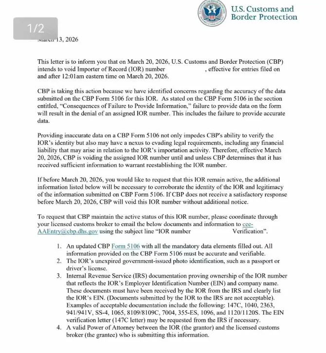 美国海关与边境保护局(CBP)拟于2026年3月20日注销该记录进口商(IOR)编号,该决定适用于2026年3月20日东部时间凌晨12:01及之后提交的报关单。