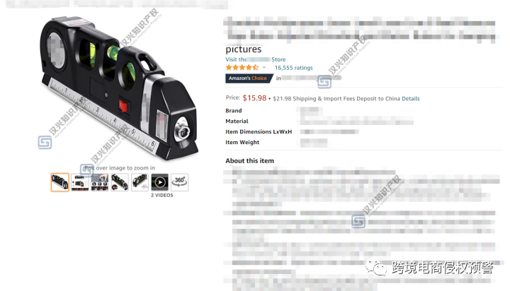 P.S.这款多功能激光水平尺,小编发现目前有多家商家在售,可能是在同一家供应商拿货吧(供货商是权利人),因为这款外观已经授权有一段时间了不然权利人不可能不维权。但是如果不是这种情况的话,其他在售的卖家对于这款外观来说都是侵权的。所以有在美国站销售相关产品的卖家,应注意规避!