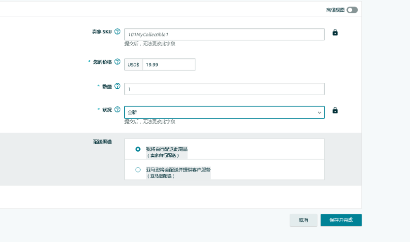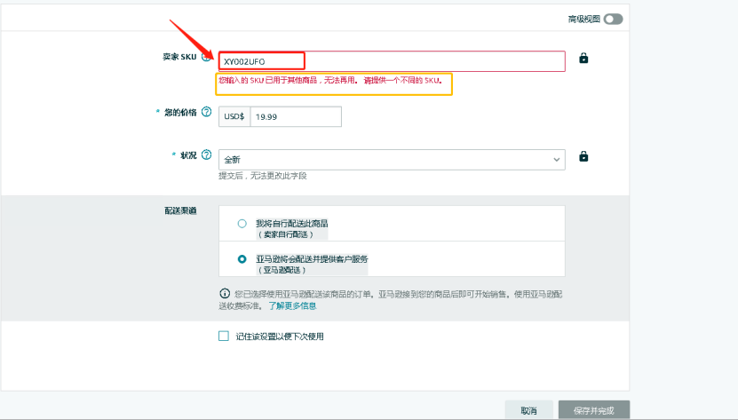 第二次跟卖:将老SKU填入卖家SKU中,价格状况同上,选择亚马逊配送,保存,出现报错后去管理库存页面搜索老SKU,将其删除,重新填写此页面再次提交。