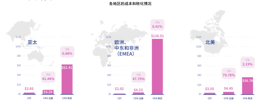 对交友应用来说,红利地区一定是要具备商业化的基础。报告显示,在 EMEA、NAR 和 APAC 地区,欧洲用户的每次安装成本最低 ($2.02),但每次购买的成本最高 ($116.51)。美国用户的购买价格更高 (2.17%) ,成本更低 ($35.93) 。所以,与其他区域市场相比,北美的用户有好的新产品探索习惯,有最完善的自然增长体系,不管是线上还是线下。也具备对其他英语国家或者欧洲国家的文化辐射,容易带起主流市场的自然新增。