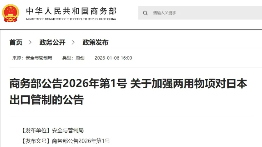 今天(1月6日),商务部网站发布《商务部公告2026年第1号 关于加强两用物项对日本出口管制的公告》。