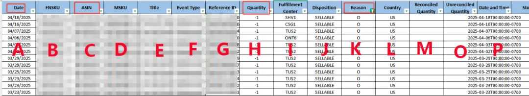 筛选数据:筛选K列数值为“O”表示出库操作;筛选C列:ASIN(匹配对应的产品);全选H列:Quantity(数量)