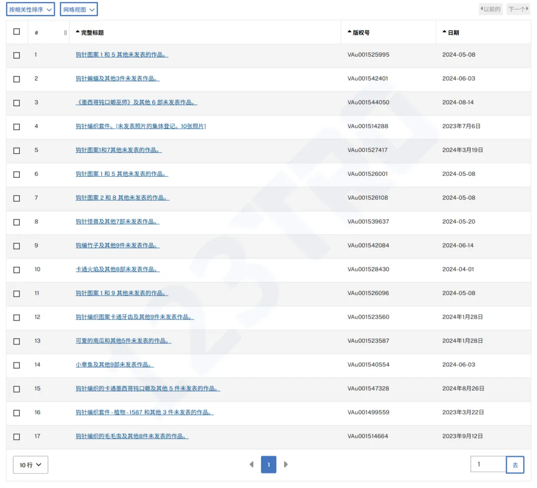 原告名下一共有17条钩针玩偶,大家可以参考版权标题的玩偶样式,并进行排查
