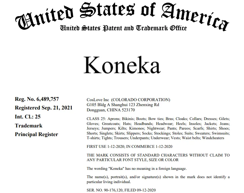 Koneka商标注册在25类,商标号6489757,已有131家店铺被告,服饰卖家需注意排查避雷:
