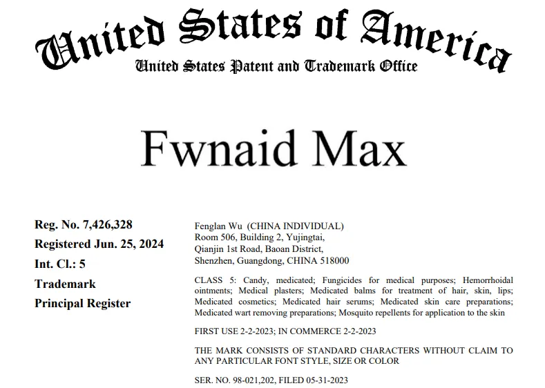 涉案商标Fwnaid Max注册在第5类药物糖果、医用杀菌剂、痔疮软膏、医用膏药、药物香膏、药物化妆品等,商标号7426328: