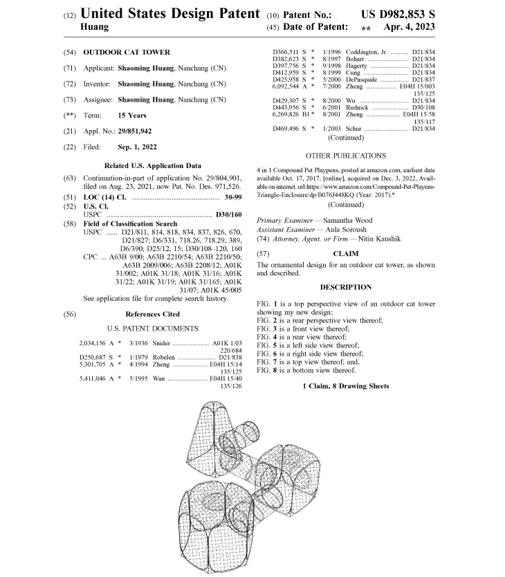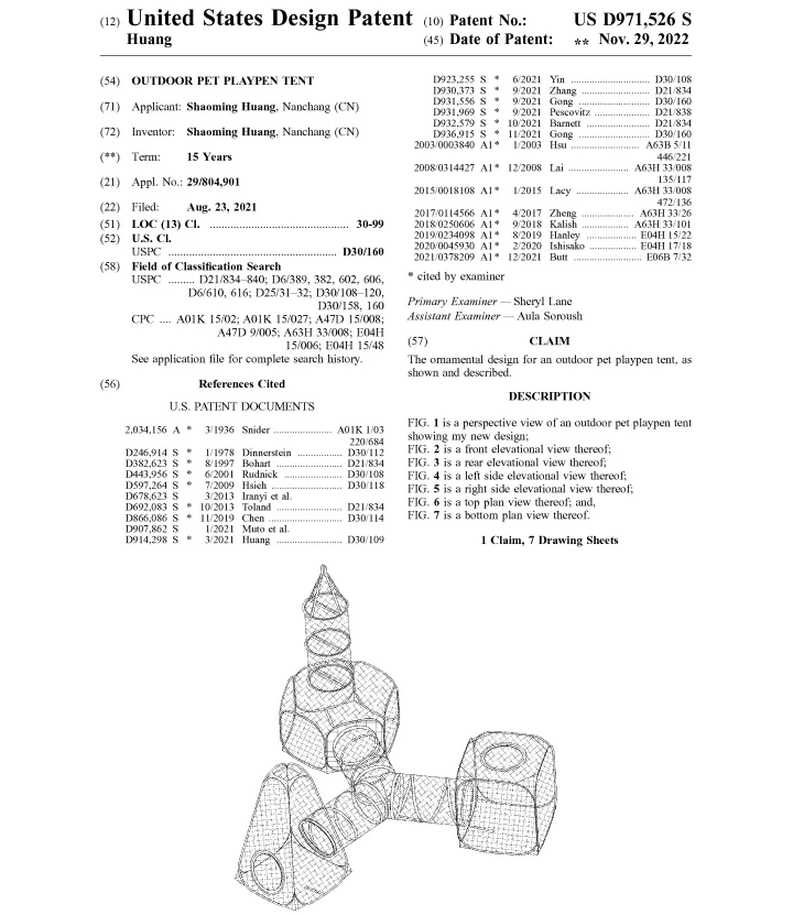 涉案专利包括两件美国外观专利及一件发明专利,专利号分别为USD971526S、USD982853S、US11939786B1,也就是说从产品外观到设计原理结构均受保护,极易踩雷,有卖相关产品的卖家务必仔细排查: