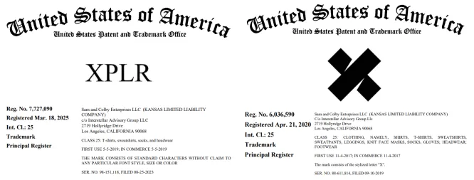 XPLR及品牌LOGO均已注册25类商标,商标号7727090、6036590: