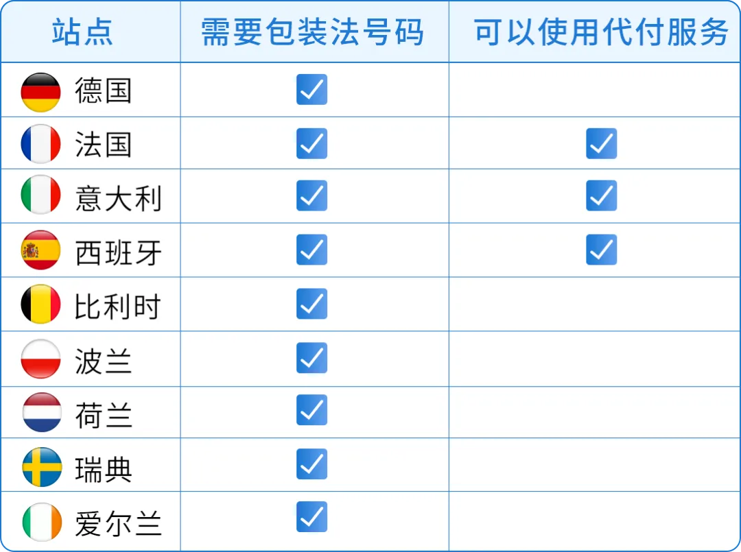 🔔 注意:即使未开通对应站点,只要商品销往奥地利、卢森堡、丹麦等欧盟国家,同样需要注册包装法编号。