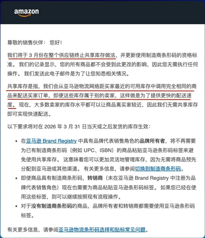 所有卖家务必在2026年3月31日前完成现有共享库存的清理,并审核FBA货件标签规范,避免政策切换导致入库延误或拒收。
