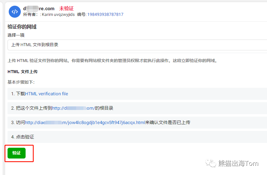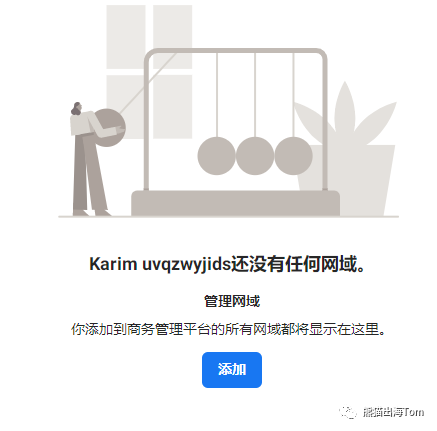 4)输入你店铺的独立域名,这个域名要和你这个BM绑定的广告账号绑定的域名一致。然后点添加网域