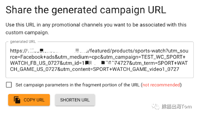输入以上信息之后,会自动生成一段含以上信息的URL,需要留意这段URL有两个部分是我们要拿出来用的,一个是整段完整的URL,还有一个是下图问号之后的URL参数字段。