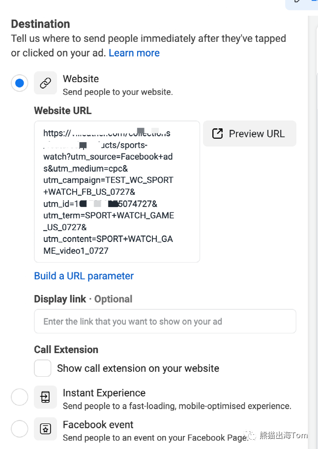 方式二:BM广告里Destination模块下Website URL添加入设置好的URL链接。