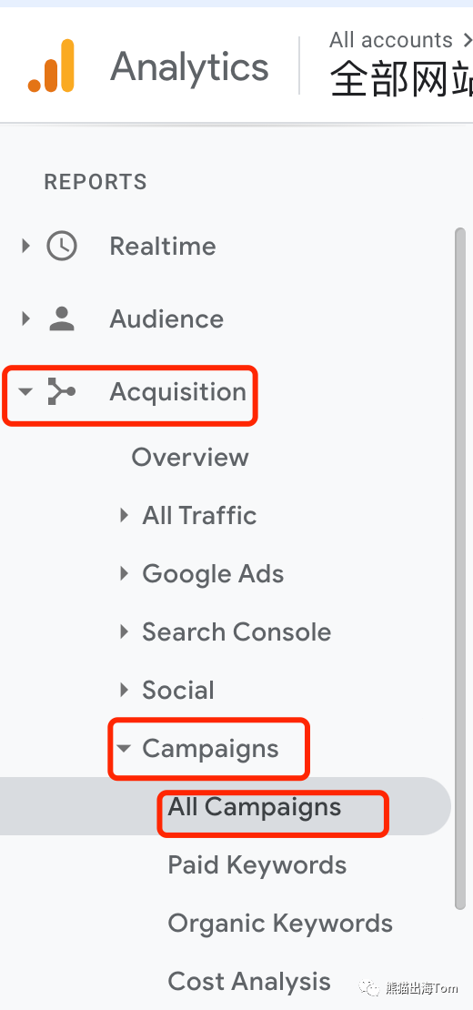 登录Google Analytics账户,左侧导航栏Acquisition–All traffic– campaigns– all campaigns
