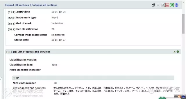点开可以看到这个商标的注册时间,商标下来的时间,以及所注册的相关类目: