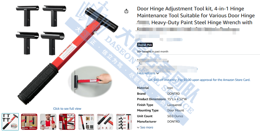原告为国人卖家Yuting Chen,这款扳手,通过创新结构升级传统工具功能。手柄采用防滑条纹设计,增强握持稳定性;模块化结构可适配不同门型,实现一扳多用。该工具能精准调节铰链阻力,有效解决门体晃动、开关卡顿问题,同时避免门柜错位、异响和五金磨损,显著提升安装效率和使用体验。无论是家庭、办公还是商业场所的门柜维护,都能提供便捷、可靠的调节方案,是安装维修人员的理想选择。