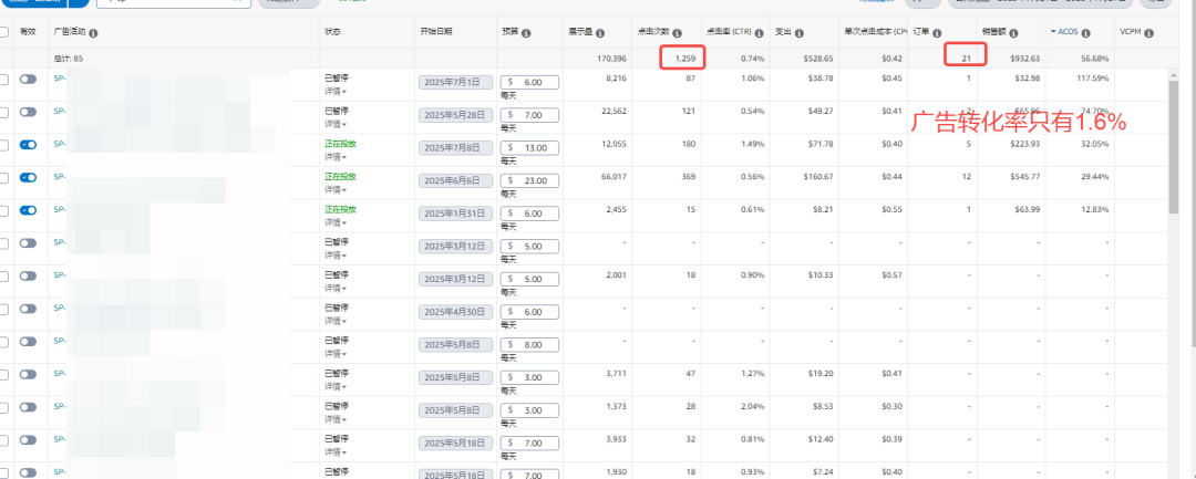 结构确实变得更干净了,无效流量也削掉不少,但实际数据告诉我,转化依旧回不去,SP广告的表现始终受制于"高退货率"标签的限制。转化率只有1.6%。