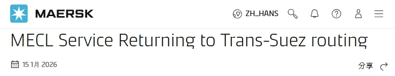 1月15日,继"“Maersk Sebarok”"号和“Maersk Denver”号成功穿越苏伊士运河后,马士基决定实施首次结构性调整,重返苏伊士运河航线。该航运集团在公告中表明,MECL服务将结构性回归跨苏伊士航线。鉴于红海及其周边地区局势持续稳定、稳定性和可靠性提升,马士基得以恢复最初设计的服务模式,为客户提供最高效的运输时间。MECL航线由马士基独家运营,连接中东、印度与美国东海岸。