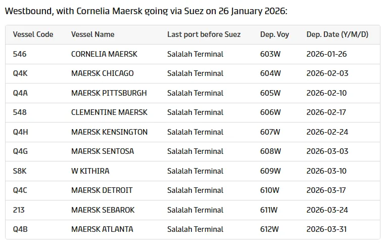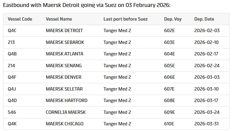 从具体安排来看,2026年1月15日,从杰贝阿里港出发的“CORNELIA MAERSK”号603W航次开始,MECL服务西行将采用跨苏伊士运河航线;2026年1月10日从北查尔斯顿港出发的“MAERSK DETROIT”号602E航次是首个采用跨苏伊士运河的东行航次,此后所有航次均遵循此航线。目前,共有14艘船舶部署在MECL航线上航行于非洲好望角,此次复航将释放运力,到第一季度末,MECL服务将仅部署12艘船舶。