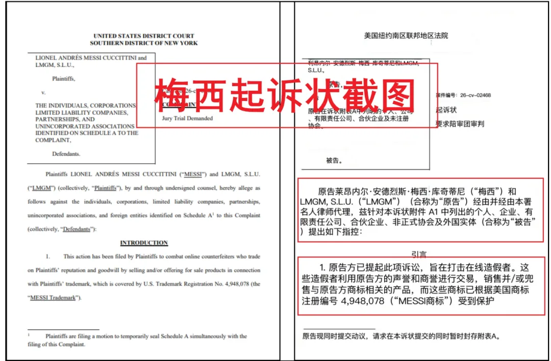 近日,足球巨星梅西及其品牌管理公司LMGM,正式向纽约南区联邦法院提起诉讼,直指T某、S某、沃尔某等平台上的中国跨境卖家售假、侵权。