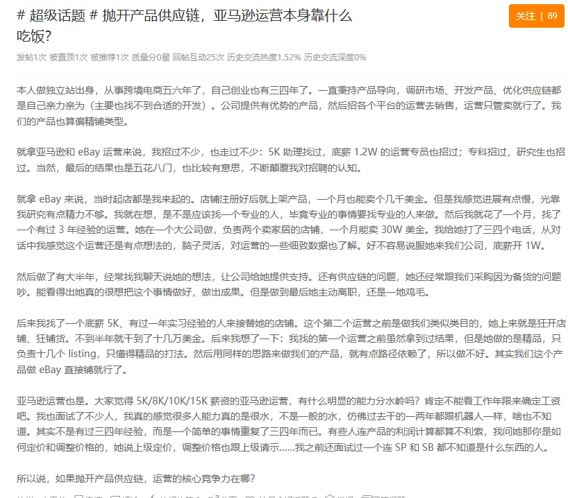 值得注意的是,发帖卖家也并不是光吐槽,也进行了一些复盘:“后来我想了一下:我找的第一个运营之前虽然拿到过结果,但是她做的是精品,只负责十几个 listing,只懂得精品的打法。然后用同样的思路来做我们的产品,就有点路径依赖了,所以做不好。”