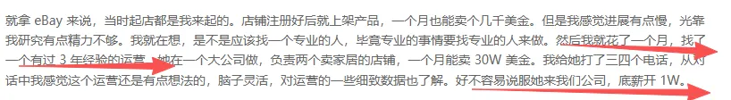 据这位发帖卖家介绍,他曾花1万底薪,耗时一个月挖来有3年大公司经验、曾操盘月销30W美金家居店铺的运营。