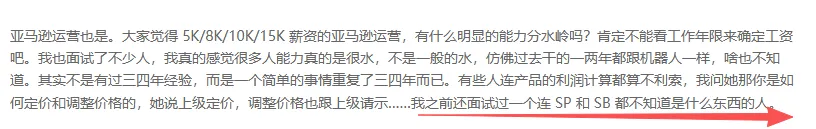 他表示,不少看似有一两年工作经验的人,实则像 “机器人” 一样机械工作,连产品利润计算都算不利索,定价和调价全靠上级指示。所谓的 “三四年经验”,不过是简单工作的重复,毫无核心能力可言。甚至最令他感到大无语的是:有面试者连SP和SB是什么都一无所知。