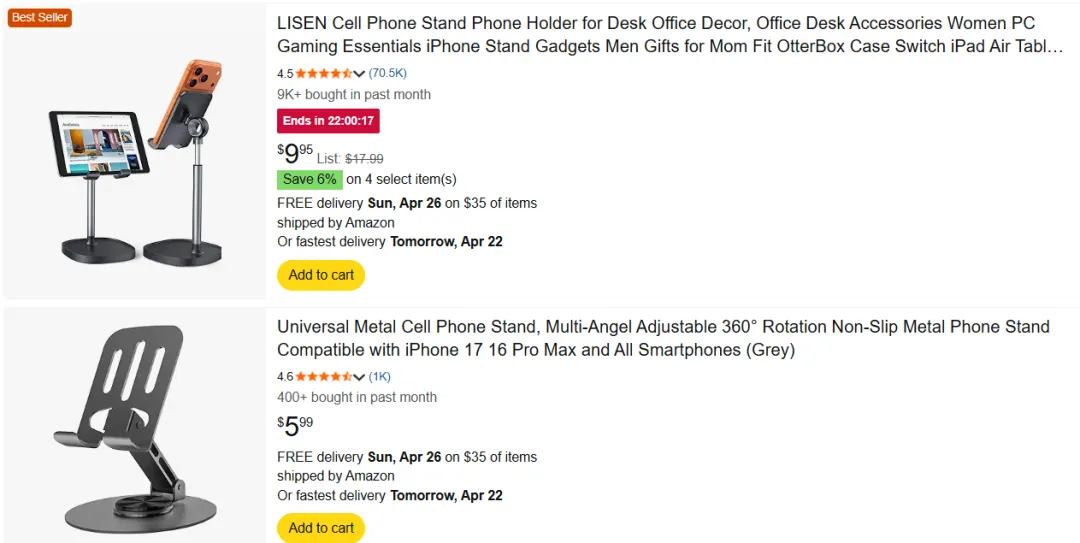 卖家可开发四脚支撑结构或锌合金底座的重载脚架,专门适配iPhone Pro Max及折叠屏手机,并作为高端卖点;结合AI智能、充电等特点,集成无线快充、具备主动散热功能的支架,提高这类产品技术壁垒。