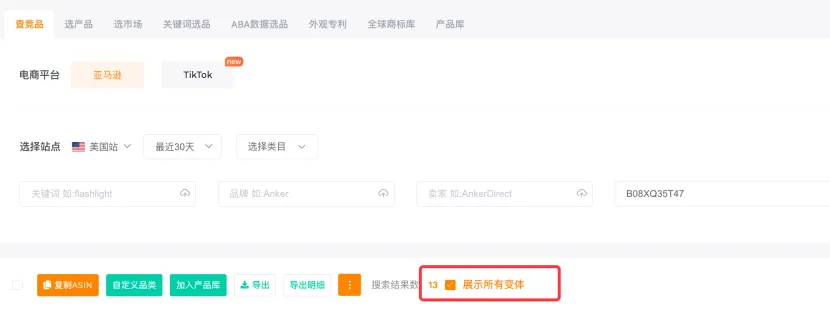 输入目标链接的ASIN,点击立即查询。进入结果页后,点击包含变体按钮