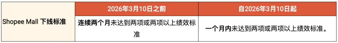 据 Shopee 消息,自 2026 年 3 月 10 日起,Shopee Mall 卖家如果在一个月内未能达到两项或两项以上绩效标准,将在当月最后一个星期二被标记为即将下架,并在下个月的第一个星期二正式下架。