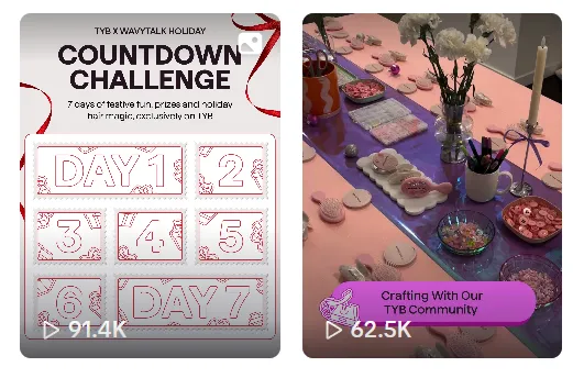 还包含 “Gift Exchanging With Your Girls”“Crafting With Our Community” 等互动话题,用 “姐妹互换礼物”“粉丝手工创作” 等形式,强化品牌的社交属性和用户粘性,均收获了不错的播放量与宣传效果。