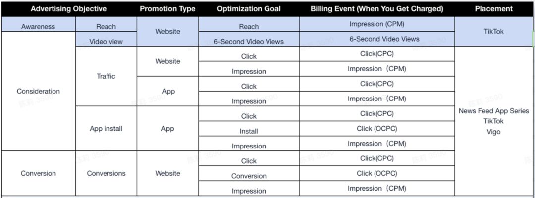 移动应用(APP Install)推广目标不变。网站(Landing Page Visit) 推广目标,如果以OCPC计费,将被绑定到新版的行为转化(conversion);如果以CPC/CPM计费,会被绑定到新版的访问量(Traffic)。