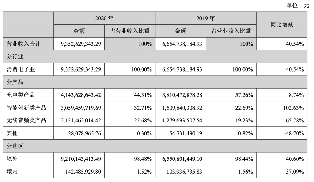 虽然受疫情影响差旅需求大幅下降,移动电源业务收入有所降低,但受益于快充类产品需求的快速提升,Anker充电类产品收入仍呈现同比增长,实现营业收入41.44亿元,占营业总收入比例为44.31%。
