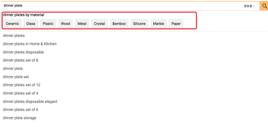 但是部分类目客户前台搜索关键词,下拉框的第一行出现了一排选择性的按钮,然后才是之前一致的长尾词推荐。这些第一排按钮都是一些属性词,可以缩小产品的搜索结果,让最精准的产品展示到客户面前,非常符合亚马逊以客户为中心的理念,如下图