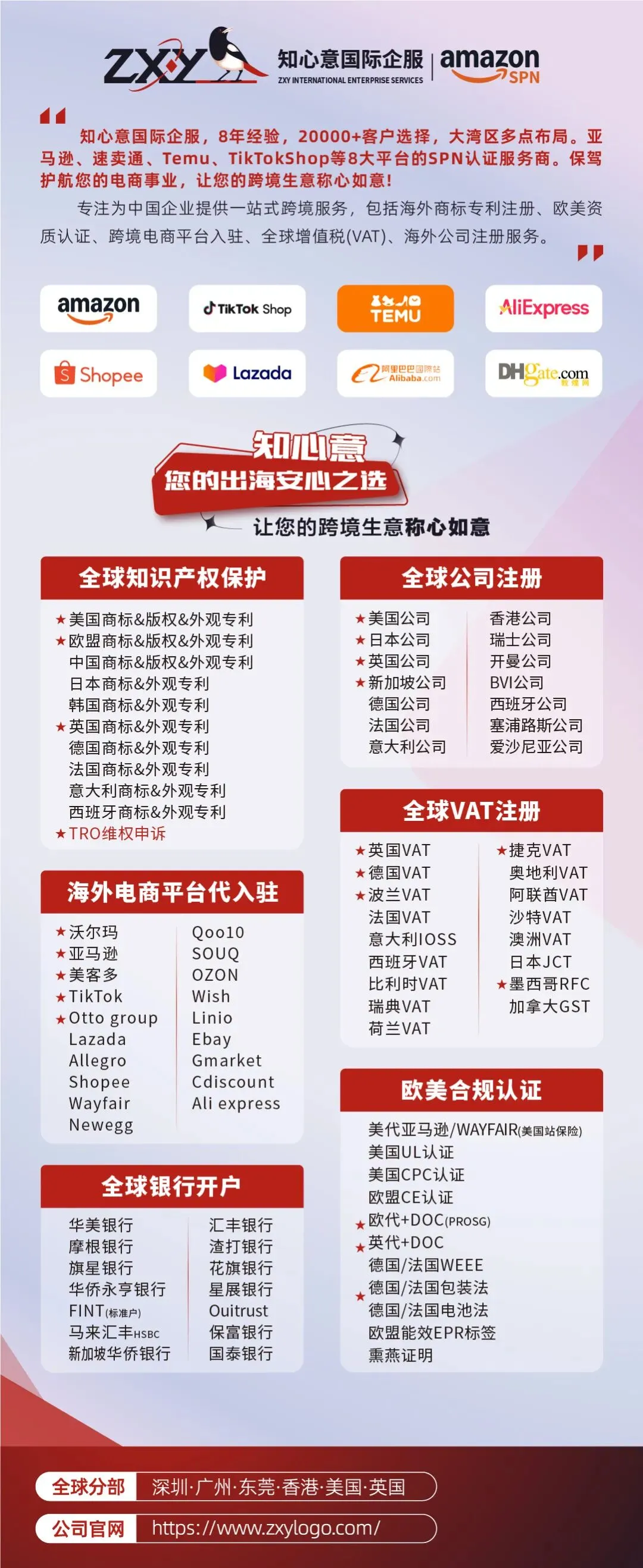 知心意国际企服是跨境电商财税法务专家,成立于2016年,8年经验,大湾区多点布局,是亚马逊/Aliexpress/Temu/TikTok/Shopee等8大电商平台推荐的SPN专业服务商。保驾护航您的电商事业,让您的跨境生意称心如意!