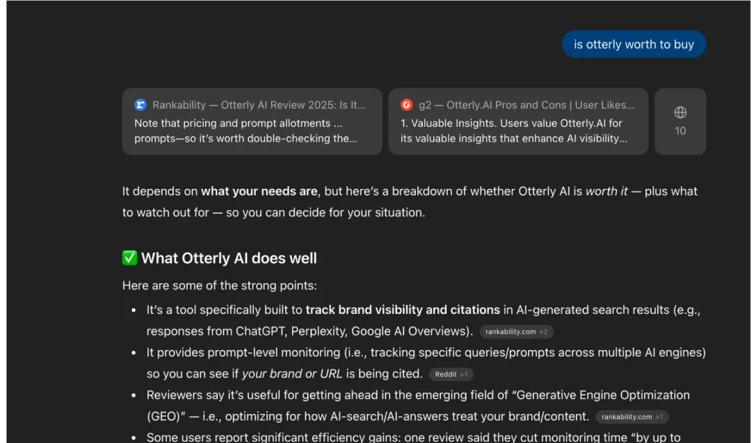 当我问ChatGPT,Otterly工具是否值得购买的时候,它会援引G2这个平台的评价