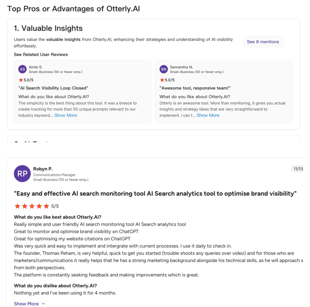 Otterly 这款工具就是借助了G2这个平台来增加他们的AI品牌声量-Share Of Voice SOV