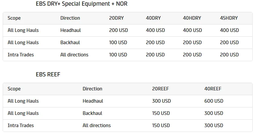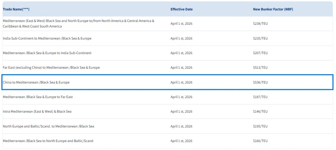 以星原3月9号发布的费率取消,4月1日采用新的费率。中国到地中海/黑海和欧洲加收536美元/TEU紧急附加费。
