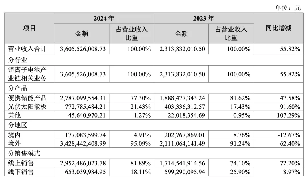 从产品收入分布来看,便携储能和光伏太阳能板产品为公司的核心产品,可应用于户外旅行、应急备灾、居家生活等场景,为客户提供绿色低碳的能源解决方案。便携储能产品是公司收入的绝对大头,2024年实现收入27.87亿元,同比增长47.58%,占公司营收比重为77.30%。