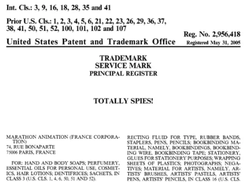 Totally Spies! 商标注册在3、9、16、18、28等多个类目,商标号2956418,未经授权切勿在listing或产品上使用: