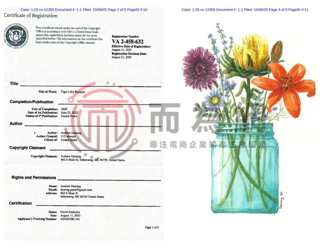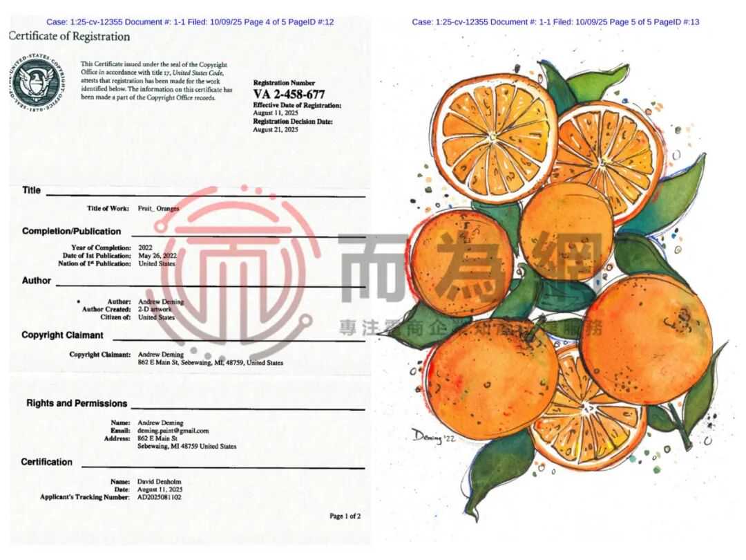 【侵权快讯】25-cv-12355 57家店铺被起诉!这两张花卉和橙子元素的水彩插画速排查下架!