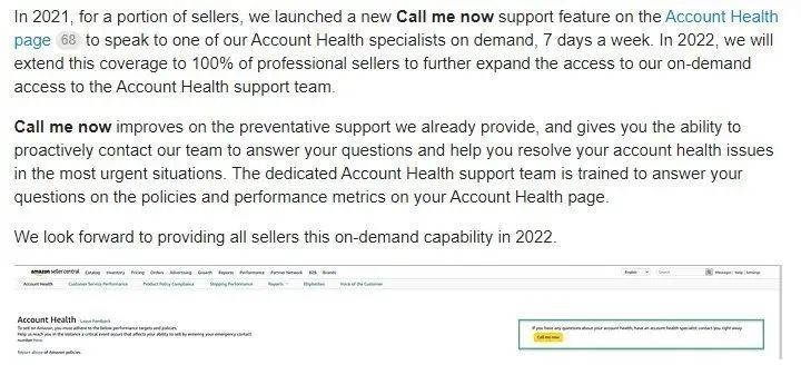 亚马逊最近发布了新公告,称将新功能“Call me now”全面开放,2022年,亚马逊卖家中心账户健康页面上的“Call me now”功能覆盖全部的专业卖家,只要是专业卖家都可以电话联系Account Health支持团队。