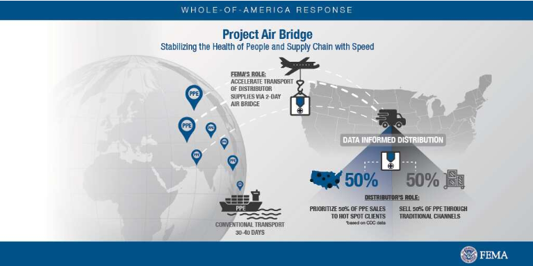 通过联邦紧急事务管理署FEMA来号召联邦、州、地方政府和私营企业之间合作,然后动用各自的关系网,从全世界统一采购物资。