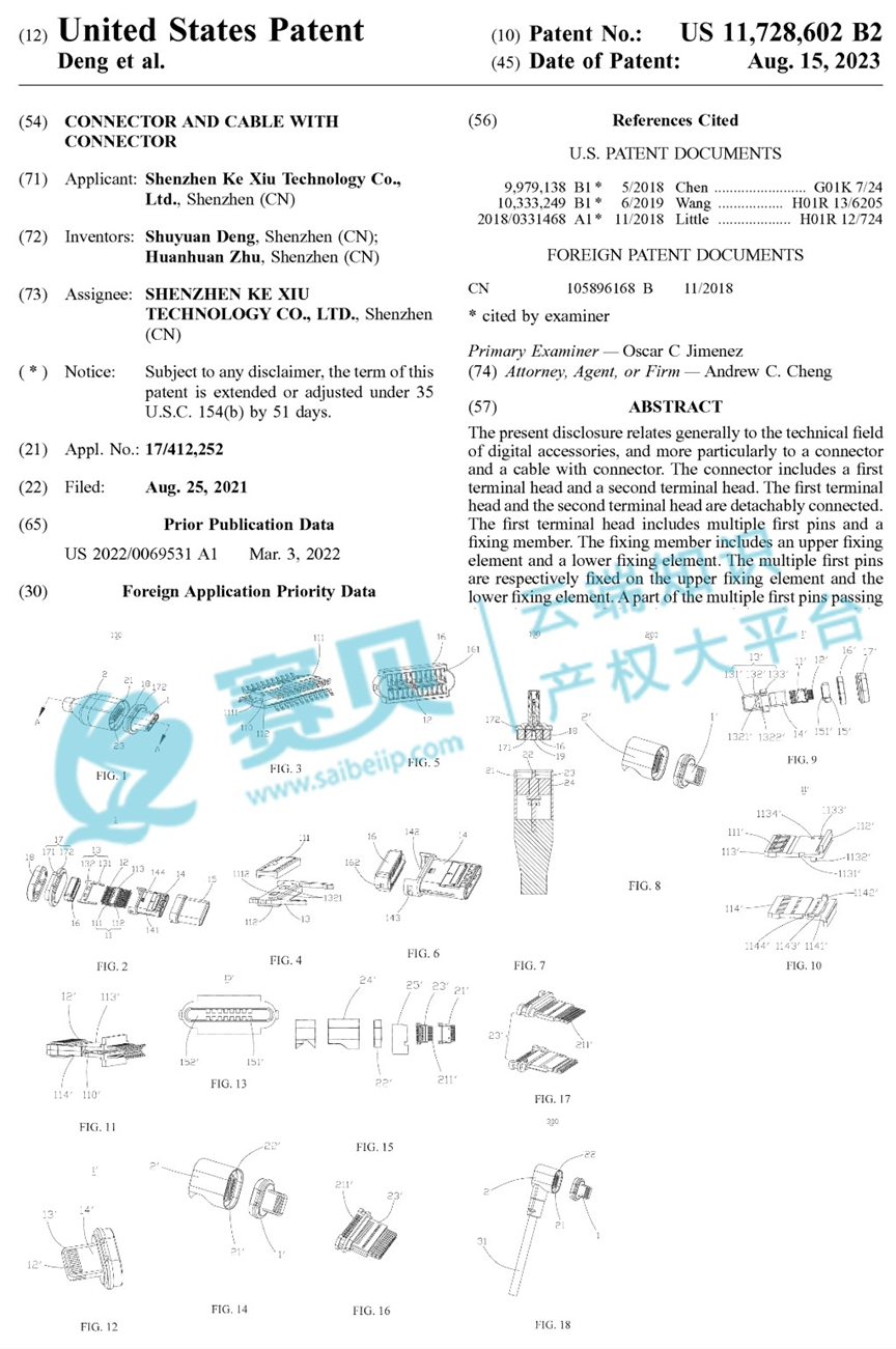 本案涉及一项美国发明专利US11728602B2,保护磁性充电线的发明原理。该充电线由两个可拆卸的连接头组成,其第一连接头上有多个引脚。这些引脚通过固定元件固定,无需焊接,降低了生产成本和难度。充电线与电缆和接口一起工作,实现电气连接。卖家需要注意即使产品外观不一样,发明原理类似也是有侵权风险的。