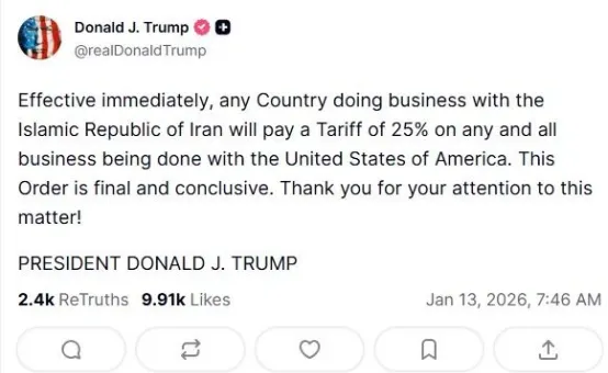 当地时间1月12日,美国总统特朗普通过其社交媒体平台表示,美国将对涉及与伊朗进行商业往来的贸易活动实施新的关税政策。根据其声明,相关商品进入美国市场时可能被加征25%的额外关税,该措施自宣布之日起生效。