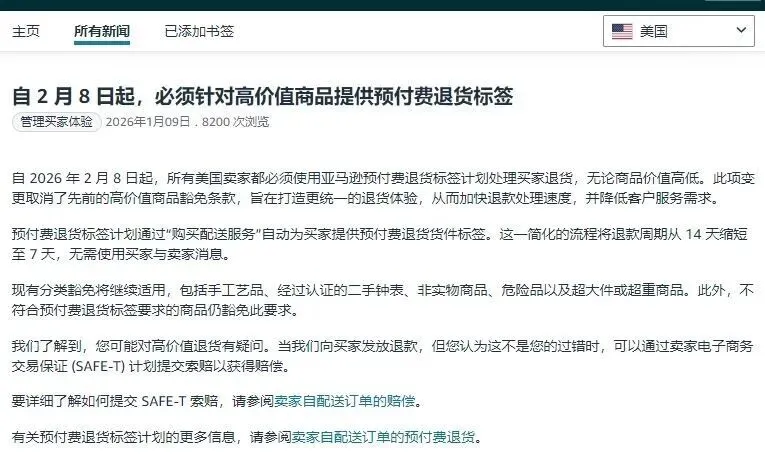亚马逊官方宣布,自2026年2月8日起,所有面向美国消费者的第三方卖家,无论商品价值高低,处理退货时均需强制使用亚马逊预付退货标签(APRL)。