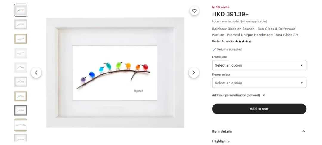 Sophie用海滩收集的再生海玻璃、鹅卵石等材料,手工拼贴成色彩斑斓的鸟类图案,搭配树枝或浮木底座,每一件作品都是手工制作、独一无二的。自2021年起,她的作品通过Etsy和官网销往世界各地,截至2025年已累计8000多笔订单。